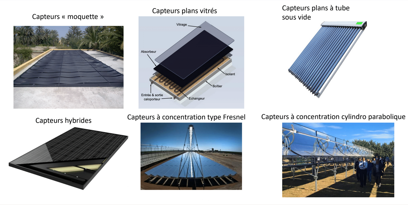 Il existe aujourd’hui plusieurs technologies de capteurs solaires thermiques : capteurs plans, capteurs à tubes sous vide, capteurs à concentrateur de Fresnel, etc.
